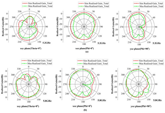 Simulation and measurement 2D radiation patterns of the proposed antenna at the frequencies of 5.2 GHz and 5.8 GHz (angle unit: degree). (a) 5.2 GHz; (b) 5.8 GHz.