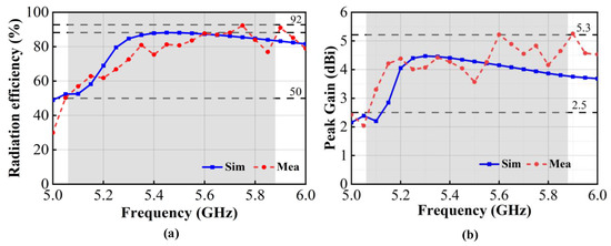 Simulated and measured radiation efficiency and peak gain of the proposed antenna. (a) Radiation efficiency; (b) peak gain.