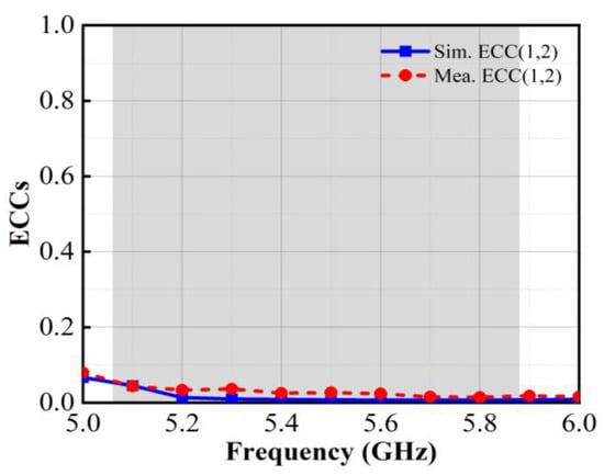 Here, Sii and Sjj denote the reflection coefficients of antenna elements i and j, respectively; Sij and Sji denote the transmission parameters between antenna elements i and j; and and denote the conjugate complexes of Sii and Sjj. The measured and simulated ECCs of the proposed 4 × 4 MIMO antenna system are shown in Figure 15. In practical MIMO antenna systems, a lower ECC value indicates a smaller correlation between the antennas and a stronger spatial diversity ability, which helps to mitigate multipath fading effects and enhances the resistance against interference in the wireless communication channel. It can be observed that the ECCs between antenna elements 1 and 2 are consistently below 0.05 (the acceptable value of the ECC is less than 0.5) in the desired band. This indicates that the proposed 4 × 4 MIMO antenna system exhibits low spatial correlation and excellent diversity performance.