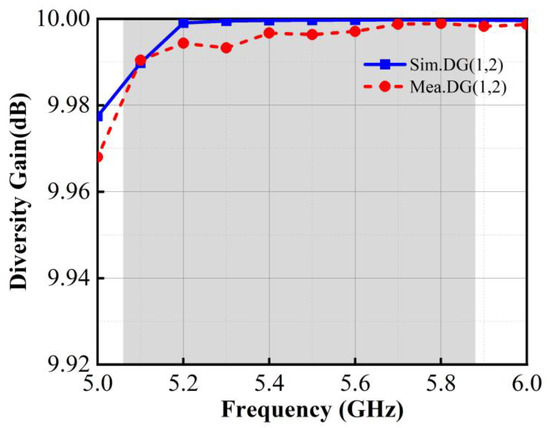 It can be observed that in the operating band of 5.06~5.88 GHz, the value of DG is better than 9.98 dB, which indicates that the MIMO antenna system has excellent spatial diversity capability. This demonstrates that the antenna can effectively utilize the multipath propagation to mitigate the signal fading and enhance the reliability of communication.