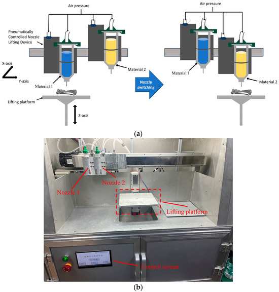 Multi-nozzle 3D printing system. (a) Working diagram; (b) physical picture.