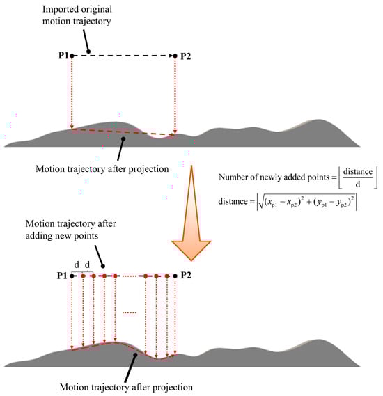 The horizontal distance between trajectory points generated using CAD2020 software may be too large, posing challenges for conformal printing on a non-planar substrate. When two points with an excessively large horizontal distance are projected onto the surface, this can prevent conformal printing and may even cause collisions with the printing nozzles. To mitigate this issue, additional points are inserted between the original trajectory points. The spacing of these new points, denoted as d, can be adjusted to control the conformal accuracy. A smaller d value results in a printing track that more closely follows the surface of the printing substrate. In this study, a spacing of d = 1 mm was selected, as shown in Figure 4.