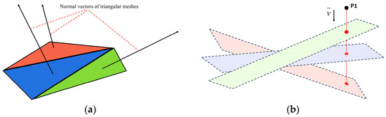 Given the projection vector , all newly added points are projected along the vector onto the plane containing the triangular meshes of the printing matrix, as shown in Figure 5. For a single original trajectory point , Formula (3) is used to calculate its projection point on an individual triangular mesh plane.