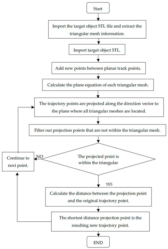 From this, the projection point of a single original trajectory point on a single triangular mesh plane is obtained. By traversing all triangular mesh planes, all projection points of this point can be calculated. In this study, the projection vector v = (0, 0, −1) is selected, so the obtained projection point has the same XY coordinates as the trajectory point, and only the Z coordinate is transformed. Although the trajectory point has a projection point on a triangular mesh plane, the projection point of this point is not necessarily within the triangular mesh range of this plane. Formula (4) is used to filter out projection points that are not within the range of the triangular mesh. If m and n in the formula exist and satisfy the condition: , it means that this point is within the range of the triangular mesh. Due to the overlap of triangular meshes on the model surface, multiple projection points persist after filtering. It becomes essential to choose the projection point with the shortest spatial distance from the trajectory point P among the remaining projection points as the final projection point.