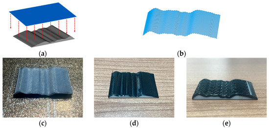 Conformal 3D printing verification experiment. (a) Plane trajectory and printing matrix; (b) Conformal 3D printing trajectory; (c) Single layer PLA printing result; (d) Single-layer TPU printing results; (e) Multi-layer TPU printing results.