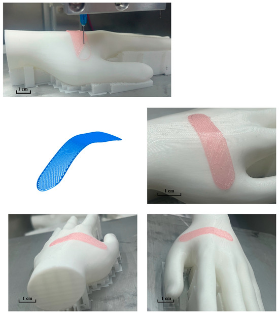 The wound repair model intended for printing and application was designed using SOLIDWORKS 2018 (Dassault Systèmes, USA) software. The model created for this experiment measured 40 mm in length and 10 mm in width. Importing this model’s STL file into Simplify3D (Simplify3D, Cincinnati, OH, USA), it was positioned at the coordinate origin and sliced. The nozzle motion trajectories x, y, and z in the resulting Gcode file were selected as the input trajectories for the algorithm. The generated conformal 3D printing trajectory was then uploaded to the multi-nozzle 3D printing system. The nozzle diameter was set at 0.39 mm, with extrusion air pressure adjusted to 260 kPa and a printing speed of 400 mm/min. To prevent collisions between the nozzle and the printing substrate, a 0.2 mm height was reserved during Z-axis calibration. Figure 9 illustrates the conformal printing effect on the surface of the human hand.