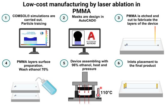 The microfluidic separator device was fabricated using an economical laser ablation method on polymethyl methacrylate (PMMA) substrates, as previously reported by Ortegon et al. [68]. Figure 2 shows graphically the manufacturing process.