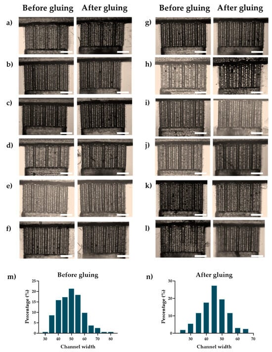 Microchannel before and after gluing. (a–l) Image collected by optical microscope before and after gluing with a 4× objective. Scale bar 500 μm. (m) Channel width histogram before gluing. (n) Channel width histogram after gluing.