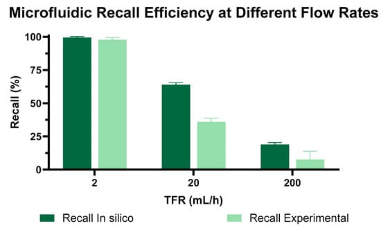 Following the geometric optimization of the Zweifach–Fung (ZF) microfluidic device, we evaluated its separation efficiency under various operational conditions. We utilized commercially available microparticles labeled with Rhodamine B to test the device’s performance, systematically varying the total flow rate (TFR) at 2, 20, and 200 mL/h to examine its impact on particle separation efficacy. The comparative results from both in silico predictions and experimental observations are compiled in Figure 5.