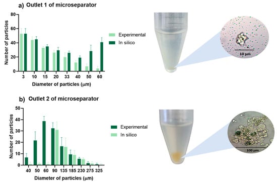 Utilizing the chitosan microparticle separation protocol developed for and applied in the evaluation of a prior device [64], we conducted a series of tests to rigorously analyze the device’s performance. The results are illustrated in Figure 6, where panel (a) details the particle distribution at outlet 1—intended for smaller particles—while panel (b) displays the distribution at outlet 2, expected to segregate larger particles. This dual-outlet analysis provided a nuanced understanding of the device’s effectiveness across a range of particle sizes.
