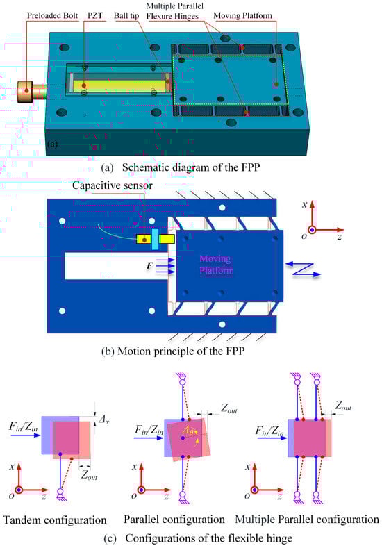 The schematic diagram and motion principle of the FPP are illustrated in Figure 1a and b, respectively. A PZT with high stiffness is utilized to drive the moving platform. The PZT cannot provide lateral stiffness and is liable to damage from lateral force. So, a ball tip has been added between the moving platform and the PZT, and the Hertzian contact condition is thus formed between the PZT and the moving platform. Therefore, the preload bolt is necessary to maintain the required contact condition. Four parallel flexible hinges are arranged on both sides of the moving platform, symmetrically. The moving platform can traverse forward and backward along the Z-axis according to a harmonic or any arbitrary excitation signal exerted on the PZT. Eight parallel flexible hinges are utilized to provide preload for the PZT and provide guidance as well as elastic restoring force for the moving platform. Compared with tandem and single parallel configuration of the flexible hinge, multiple configurations have more advantages in decreasing the parasitic error on the X-axis (i.e., Δx) and rotating around the Y-axis (i.e., Δθ), as shown in Figure 1c. A high-precision capacitive sensor is used to measure the actual displacement of the moving platform for closed-loop displacement feedback control. It should be noted that an FPP working in non-resonant mode needs to deliver controlled vibratory displacements along the Z-axis and provide sufficient displacement, output stiffness, and high response frequency.