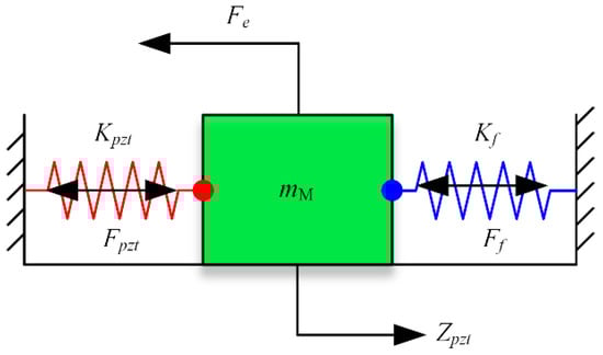 From the dynamics point of view, the PZT can be considered as a spring system with stiffness Kpzt. The flexible hinges of the FPP can be deemed equivalent to a spring acting on the moving platform, with the stiffness Kf. The equivalent mechanical model of the FPP was obtained and is shown in Figure 2. mM is the equivalent mass of the moving platform, Ff and Fpzt represent the force exerted on the PZT and flexible hinges, respectively. Fe is the effective output force of the FPP, i.e., external loads exerted on the moving platform.