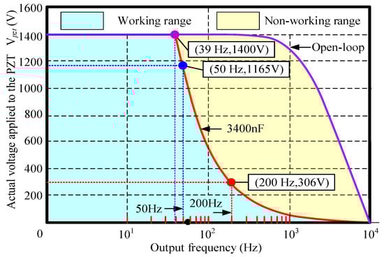 When the capacitance value of PZT was 3400 nF, in order to ensure the actual voltage of 1400 V applied to the PZT Vpzt, the maximum output frequency of the PZT driver was 39 Hz. When the output frequency exceeded 39 Hz, actual voltage applied to the PZT Vpzt, playing an important role on the output displacement of the PZT, was lower than 1400 V, and decreased sharply when the frequency of the analog signal at the control input was increased. The actual voltages applied to the PZT Vpzt were 1165 V and 306 V, when the critical output frequencies (i.e., maximum output frequency) were 50 Hz and 200 Hz, respectively.