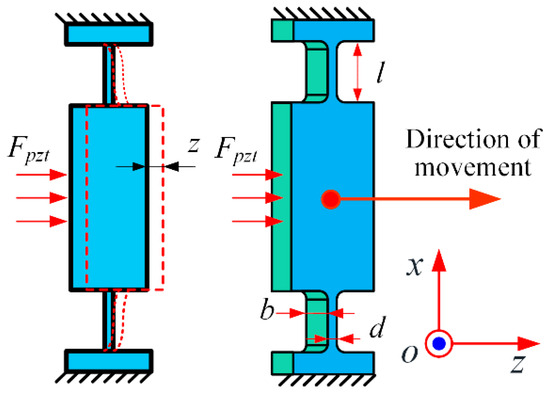 As previously mentioned, the stiffness of the flexible hinges on the Z axis is a crucial parameter. The deformation and structure of the parallel symmetrical flexible hinge under the driving force are depicted in Figure 6, where z represents the displacement of the moving platform under the driving force Fpzt, while b, d, and l denote the width, thickness, and length of the flexible hinge, respectively.