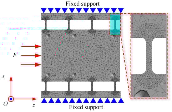The theoretical calculations from the second section were verified using finite element analysis (FEA) with ANSYS 2022R1 software. The SOLID187 element was employed for meshing the FPP mechanism. The finite element model is shown in Figure 7. The mesh size for the main body was set to 4 mm, while the mesh size for the flexible hinge parts was refined to approximately 0.8 mm.