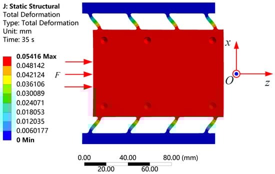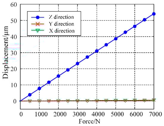 The stiffness model established earlier was validated using the finite element analysis method. During the analysis, a force ranging from 0 to 7000 N was applied at the input end of the moving platform with a step size of 500 N, while the sides of the platform were fixed. The resulting deformation of the platform is shown in Figure 8. The relationship between the exerted force and the output displacement of the moving platform is depicted in Figure 9. The stiffness of the moving platform in the Z direction was found to be 129.14 N/μm, consistent with the theoretically calculated value of 130 N/μm. Additionally, compared with the Z axis direction, the displacements in the X and Y axis directions are negligible, indicating that the moving platform output displacement was primarily in the Z axis direction and demonstrating good guiding performance via the four parallel plate sliding pairs.