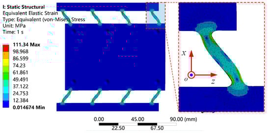 To validate the reliability of the platform structure, stress analysis was conducted. The maximum working displacement of the moving platform was set to 50 μm. During the stress analysis, the sides of the platform were fixed, and a displacement of 55 μm was applied to the input end of the platform. The equivalent stress distribution of the flexible hinge is shown in Figure 10. The maximum equivalent stress was found to be 109.3 MPa, significantly lower than the allowable stress of 280 MPa for 2A12 aluminum alloy.