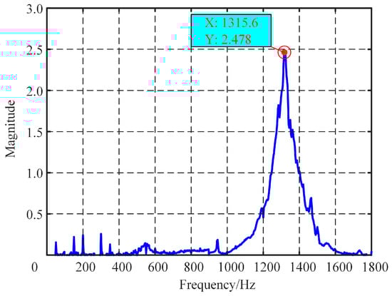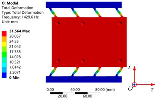 Modal analysis of the moving platform was conducted to determine its first-order natural frequency. During the analysis, the sides of the structure were fixed. The results, shown in Figure 11, indicated that the resonance frequency of the flexible feed platform was 1429.6 Hz. This result deviated by approximately 2.3% from the previously calculated value using the analytical model, demonstrating a close agreement and confirming the reliability of the theoretical calculations established earlier.