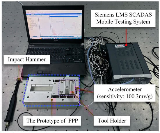 The modal test was conducted using the impact hammer excitation method to investigate the actual dynamic performance of the FPP. Figure 12 illustrates the experimental setup for the modal analysis of the FPP. A B&K accelerometer was mounted on the moving platform (a tool holder was installed on the moving platform to facilitate the accelerometer installation, with the accelerometer attached to the tool holder) to measure the response induced by the impact force. The impact hammer provided pulse impact excitation to the platform, and the force sensor attached to the hammer measured the impact force. The force and corresponding acceleration signals were amplified by a charge amplifier and then fed into a dynamic analyzer (LMS SCADAS Mobile Testing System, Siemens, Berlin, Germany). Using modal analysis software, the frequency response function (FRF) of the developed positioning platform was obtained, and the experimental results are shown in Figure 13. The discrepancies between the analytical calculation, finite element analysis, and experimental results were 6.87% and 8.67%, respectively. Considering the mass of the tool holder, which may cause a slight reduction in the measured first-order resonance frequency, it can be concluded that the experimental results are in good agreement with the analytical and finite element analysis results.