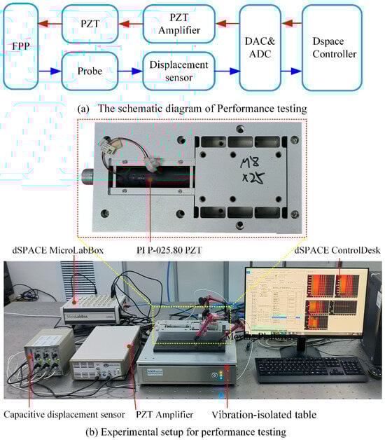 A series of experimental tests were conducted to verify the input/output characteristic and to establish performance measurements for the FPP. The experimental principle and experimental setup are shown in Figure 14. The schematic diagram of performance testing is illustrated in Figure 14a. The control signal was generated using a MicroLabBox (dSPACE, Paderborn, Germany) and amplified by the Trek PZD700A (Advanced Energy, Fort Collins, CO, USA) voltage amplifier to drive the P-025.80 (PI, Karlsruhe, Germany), enabling the forward and backward feed of the moving platform. Three capacitive displacement sensors CPL290 (Lion, Minneapolis, MN, USA) with a resolution of 1 nm and dynamic range of 1.5 kHz were utilized to measure the output displacement of the moving platform in the X, Y, Z axes, respectively. The real-time display and recording of experimental data were also carried out via the dSPACE MicroLabBox. To reduce external disturbance such as vibration, the experiments were performed on a vibration-isolated table VAIS AMT 045 (AMTEK, Berwyn, IL, USA).