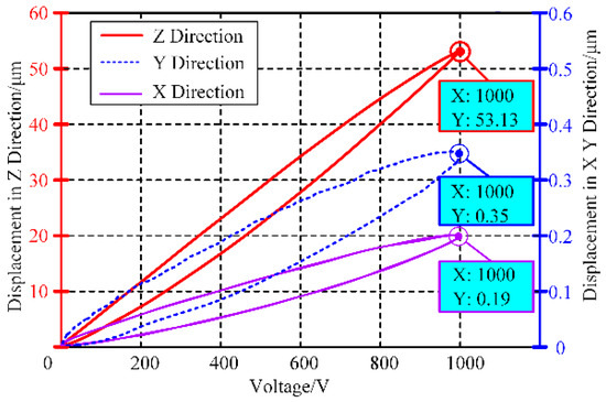 A travel range test was conducted to determine the maximum working space of the moving platform. During the test, a 1000 V amplitude, 1 Hz frequency sine wave was applied to the PZT and the displacements of the moving platform in the X, Y, and Z directions were recorded. The test results, shown in Figure 15, indicate that the maximum output displacement in the Z direction reached 53.13 µm. The coupling displacements in the X and Y directions were 0.35% and 0.66% of the Z displacement, respectively. These results demonstrate that FPP can achieve large displacements while maintaining good guiding performance.
