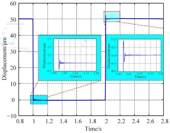 The closed-loop step response test employed a controller established using the PID feedback control algorithm. Using a real-time displacement step signal ranging from 0 to 50 μm to drive the PZT, the output displacement signal of the platform is shown in Figure 16. The experimental results indicated that when the step magnitude was 50 μm, the stabilization times of the moving platform for the falling and rising edges were 37 ms and 26 ms, respectively, with corresponding overshoots of 0.9% and 1.8%. Thus, by optimizing the feedback control algorithm and controller parameters, the platform can achieve good performance in terms of fast response and precision control.