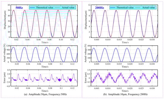 Signal tracking capability is a crucial feature of the large-stroke fast position platform, reflecting its adjustment speed during operation. The signal tracking test employed sine waves with frequencies of 50 Hz and 200 Hz to measure the tracking error of the moving platform at displacements of 50 μm and 10 μm, respectively. To compensate for the hysteresis effect of the PZT, a control strategy combining PID and inverse PI models was used. The test results are shown in Figure 18. When the amplitude and frequency of the signal were 50 μm and 50 Hz, respectively, the maximum tracking error was about ±1.96 μm (approximately 3.92% of the stroke); when the amplitude and frequency of the signal is 10 μm and 200 Hz, respectively, the maximum tracking error was about ±0.59 μm (approximately 5.9% of the stroke), demonstrating good signal tracking ability of the developed FPP. Higher response frequency can be realized by reducing the output displacement. These phenomena are consistent with the previous analysis and validate the theoretical model presented in this paper. Advanced control algorithms used for compensation of the tracking error as well as nonlinear characteristics of PZT will be fully considered and systematically applied in further research.