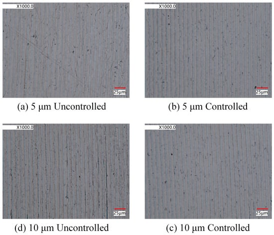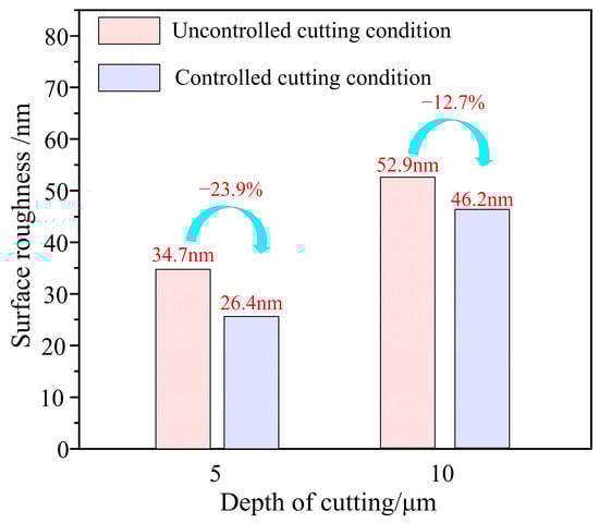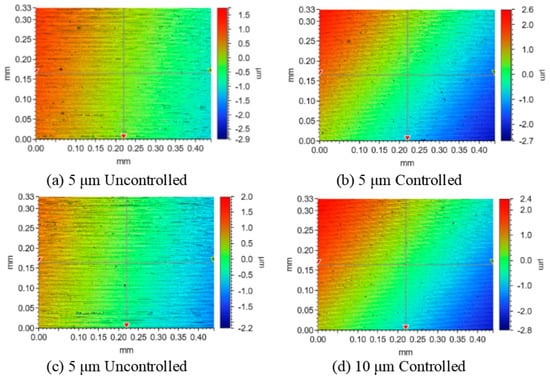The end face turning experiments were conducted using a UPT250 precision lathe (JCSGY, Beijing, China) to validate the machining performance of the FPP. The specific experimental setup and cutting conditions are shown in Figure 19 and Table 3, respectively. The tool holder was installed on the FPP and was driven forward by the FPP to implement the precision feed operation. The tool position was initially set by the Z-axis feed drive of the UPT250 precision lathe; after the trial cutting was completed, the Z-axis was then fixed. Under the controlled cutting conditions, the cutting depth was set solely by the PZT of the FPP, while under the uncontrolled cutting condition, the cutting depth was set by the preload bolt and capacitive sensor. For both the uncontrolled and controlled cutting conditions, except for cutting depths, all of the cutting parameters were identical. Four sets of cutting experiments were conducted based on different cutting depths and tool position settings. The magnified images of the two processed surface topographies captured at 1000x magnification by VHX970F (Keyence, Osaka, Japan) are shown in Figure 20. For both the cutting depths, the surface integrity under controlled cutting conditions was better than uncontrolled cutting conditions. The roughness of the machined surface was measured using ContourGT (Bruker, Berlin, Germany), and the surface roughness of the processed workpieces is shown in Figure 21. The comparison of the results between controlled and uncontrolled cutting conditions is illustrated in Figure 22. When the cutting depths were 5 μm and 10 μm, the surface roughness was 34.7 nm and 52.9 nm under uncontrolled conditions, respectively; the surface roughness was 26.4 nm and 46.2 nm under controlled conditions, respectively. Compared with the uncontrolled conditions, the values of surface roughness under controlled conditions decreased by 23.9% and 12.7%, respectively. The cutting test results indicate that the developed FPP device has excellent precision machining performance.