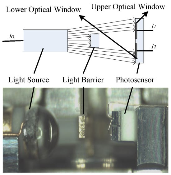 Figure 2 illustrates the components of the precision photosensor; it is composed of three main components: a light source, a light barrier, and a photosensor. The light source, powered by a current, emits infrared light at a constant frequency. Positioned centrally and integrated with the accelerometer’s flexible pendulum, the light barrier splits the infrared light from the source into two separate beams. These upper and lower beams irradiate the respective upper and lower optical windows of the photosensor. Each optical window then transforms the incident light intensity into induced currents, denoted as I1 and I2. The relationship between these induced currents (I1 and I2) and the light intensity P is linear and can be mathematically formulated as follows: