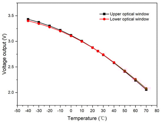 Upon the removal of the photosensor’s light barrier, a signal acquisition circuit was designed for testing purposes. By driving the light source with a constant current of 3 mA across a range of temperatures, the currents at the upper and lower optical windows were amplified. These currents were then converted into voltage outputs, as illustrated in Figure 3.
