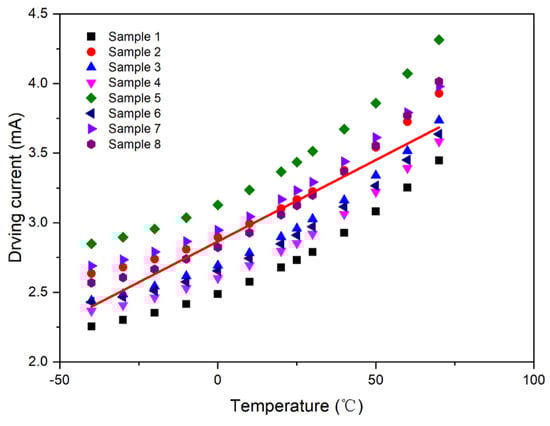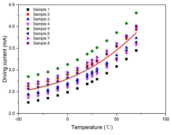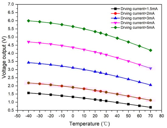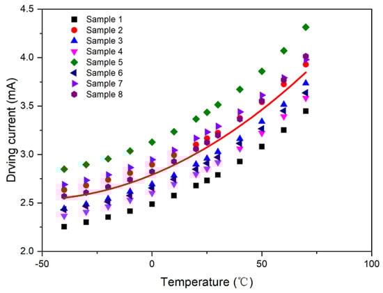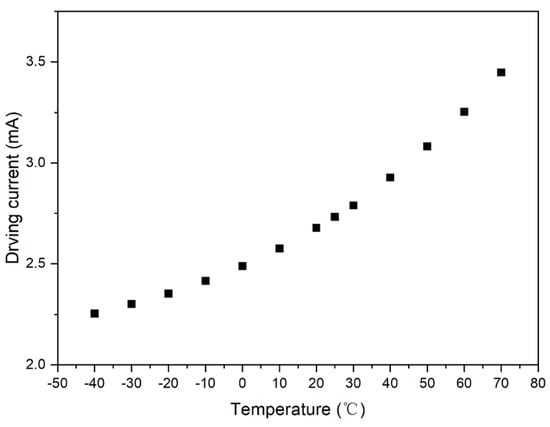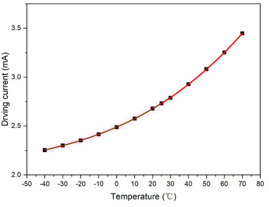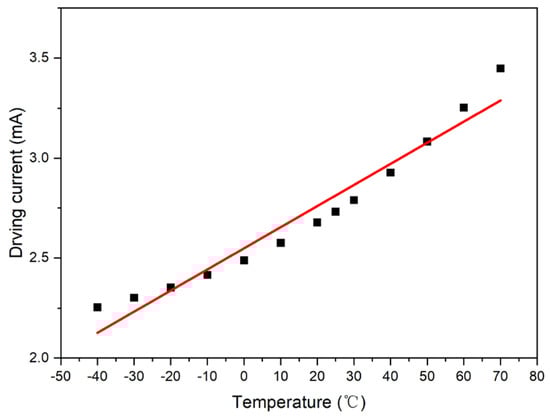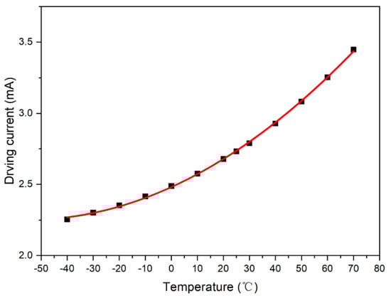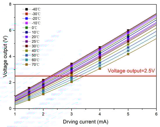 The output value of the photosensor was set to a fixed value: V0 = 2.5 V, and the intersection point formed by the test curve and straight line, V0 = 2.5 V, was plotted. Accordingly, the driving current compensation curve with respect to temperature was obtained, as shown in Figure 6.