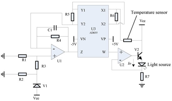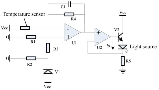The hardware circuit, as depicted in Figure 11, was crafted in alignment with the first-order compensation scheme. A temperature sensor was employed to gather temperature data as the input for the system. A stable voltage reference was established using the voltage reference diode V1, along with resistors R1 and R3. Operational amplifiers U1 and R4 were used to achieve amplification and linear calculations. Finally, the combined current source from operational amplifier U2, power tube V2, and resistor R5 generated the feedback drive current Io, for driving the light source to achieve the compensation function.