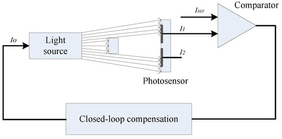 A closed-loop compensation scheme, as delineated in Figure 21 and grounded in the principles of automatic control, has been crafted. This scheme employs a target reference current, , which is utilized for continuous, real-time comparison against the output current, I1, derived from the upper optical window of the photosensor. If the condition I1 > is met, the driving current for the light source, Io, is appropriately reduced. Conversely, if I1 < , Io is incremented. Should I1 be equal to , the driving current remains stable. This sophisticated arrangement allows for the dynamic monitoring and adjustment of the light intensity detected by both the upper and lower optical windows of the photosensor. In response to temperature fluctuations, the values of I1 and I2 are bound to shift; the closed-loop system promptly adjusts the driving current Io to counteract these changes, ensuring that the light source’s intensity is modified to restore I1 to the desired level. Furthermore, the system is adept at addressing the degradation in photosensor performance that can occur due to prolonged operation or other environmental factors. The closed-loop compensation mechanism ensures that I1 and I2 are rectified to their requisite values, thereby maintaining the photosensor’s output integrity and reliability over time. This adaptive capability is a testament to the robustness and accuracy afforded by the closed-loop compensation scheme in navigating the intricate dynamics of photosensor operation.