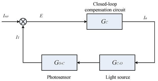The control block diagram, as outlined for the aforementioned closed-loop compensation scheme and presented in Figure 22, illustrates the system’s operational flow. represents the preset reference current, while I1 signifies the output current from the photosensor’s upper optical window. The variable E represents the differential value between these two currents. When these currents are fed into the compensation circuit, they are governed by the transfer function . The resultant drive current Io, which powers and illuminates the light source, is determined by another transfer function, denoted as . The photosensor’s role in transforming the incoming light into an electrical current output is described by the conversion relationship . This closed-loop system is designed to dynamically adjust and stabilize the photosensor’s performance, ensuring optimal output irrespective of environmental variations.