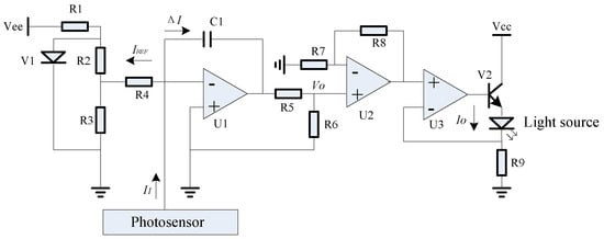 The analog circuit, as depicted in Figure 23, was crafted to implement the aforementioned closed-loop compensation scheme. It utilized the voltage reference V1 alongside resistors R2, R3, and R4 to produce the reference current, denoted as . The current I1, emanating from the photosensor’s upper optical window, was offset by , yielding a difference signal. This difference was then integrated by the operational amplifier U1 and capacitor C1, resulting in the formation of the feedback voltage Vo. Subsequently, this voltage was amplified by the components U2, R7, and R8. Ultimately, the feedback drive current Io was generated by the confluence of operational amplifier U3, power tube V2, and resistor R9, which in turn drove the light source, thereby accomplishing closed-loop control.