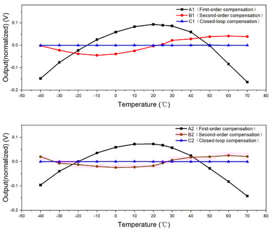 Samples 1–8 used these unified second-order compensation model for compensation; that is, Io = 8.12 × 10−5 × T2 + 0.009273 × T + 2.772991. The output curve with respect to temperature was simulated and calculated after data normalization, as shown in Figure 14.
