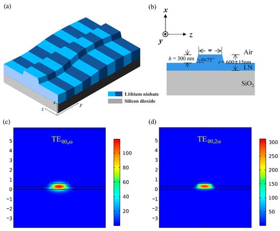 Unlike the adapted poling design, we aim at adjusting the waveguide structure, making local structural adjustment at positions of inhomogeneous thickness. Thereby, it eliminates the phase errors and enables the achievement of optimal QPM throughout the entire waveguide. Figure 1a,b are the three-dimensional schematic and cross-sectional illustration of the proposed waveguide, respectively. The length of the proposed waveguide is L = 21 mm. The TFLN consists of a X-cut lithium niobate thin film with a thickness of t = 600 ± 15 nm and a 2 μm thick silicon dioxide layer. The etched depth and sidewall angle are h = 300 nm, and θ = 75°, respectively, and w is the waveguide width. In X-cut TFLN, TE modes are often chosen to utilize the maximum nonlinear coefficient d33, thus enhancing the SHG efficiency. The modal field distribution of TE fundamental modes for FF wave at 1600 nm and SH wave at 800 nm are shown in Figure 1c,d.