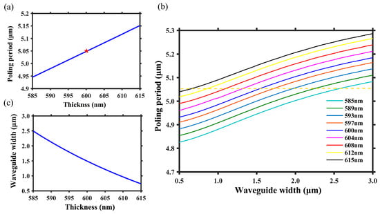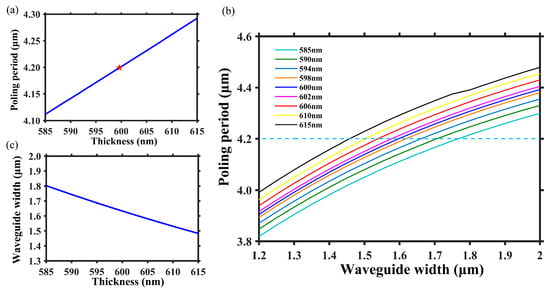 (a) The relationship between poling period and LN thickness when the other waveguide structural parameters are fixed. The red star represents the required poling period when LN thickness is 600 nm, and the blue line represents the required poling period as LN thickness changes. (b) The variation of poling period with waveguide width under different LN thicknesses. (c) The required waveguide width as a function of LN thickness when poling period sets as Λ = 4.20 μm.