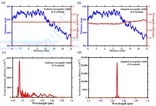 As depicted in Figure 3a,b, the blue curves represent LN thickness along the waveguide direction with the distance of 21 mm and the specific data are based on the measured results reported by Chen et al. []. The thickness data along the waveguide are accessed with a step size of 50 μm. As the waveguide length is 21 mm, the adapted-width waveguide is actually composed of 420 sections. Each section is 50 μm long, and its width is set with the precision of 10 nm scale in the simulation. As the red lines shown, Figure 3a,b depict two designs featuring uniform and adapted waveguide width, respectively, with the same and single poling period of 4.20 μm. Due to the required poling period varies with LN thickness, the etched waveguide based on PPTFLN with uniform waveguide width demonstrates significant deviation from the theoretical sinc2 function in its SH spectrum. As shown in Figure 3c, the center wavelength moves to shorter, the simulated peak efficiency is 3724%W−1, and the number of side lobes and peaks increases. However, by employing the adapted waveguide width design based on Figure 2c, a locally structural adjustment is made to the positions of different thicknesses, thus solving the problem of phase errors. Figure 3d illustrates that its SH spectrum aligns with the theoretical sinc2 function. In comparison to uniform waveguide width design, it demonstrates higher peak efficiency and narrower bandwidth, with the simulated peak efficiency of 21,780%W−1, which indicates that the inherent nanoscale inhomogeneity of TFLN can be addressed through adapted waveguide width design.