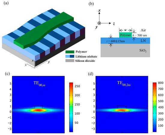 By adding polymers to TFLN, it can form a region in which the effective refractive index is higher than that in the regions without polymers, thereby forming an optical waveguide. Figure 4a,b are the three-dimensional schematic and cross-sectional illustration of the proposed polymer-loaded waveguide with adapted waveguide width design, respectively. The length of the proposed waveguide is L = 21 mm. The effective refractive index of loaded waveguide depends on the thickness of LN layer t, the thickness of polymer layer h, and the polymer waveguide width w. The polymer (ARP6200) layer with a thickness of h = 500 nm is spun on TFLN, then exposed and developed to form a waveguide with a width of w. The TFLN consists of an X-cut lithium niobate thin-film with a thickness of t = 600 nm ± 15 nm and a 2 μm thick silicon dioxide layer. Similarly, TE modes are chosen to utilize the maximum nonlinear coefficient d33, thus enhancing the SHG efficiency. The modal field distribution of TE fundamental modes for FF wave at 1600 nm and SH wave at 800 nm are shown in Figure 4c,d.