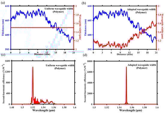 As the red lines shown, Figure 6a,b depict two designs featuring uniform and adapted waveguide widths, respectively, with the same poling and single period of 5.05 μm. Similarly, due to the inhomogeneity of LN thickness, the polymer-loaded waveguide based on PPTFLN with a uniform waveguide width design demonstrates significant deviation from the theoretical sinc2 function in its SH spectrum. As shown in Figure 6c, the uniform waveguide design also exhibits a shift in the central wavelength and an increase in the number of side lobes and side peaks, and the simulated peak efficiency is 1373%W−1. Yet after applying the adapted waveguide width design based on Figure 5c, the SH spectrum closely aligns with the sinc2 function. Due to the elimination of side lobes and side peaks, as depicted in Figure 6d, the peak efficiency is significantly improved to 6925%W−1. Therefore, the adapted waveguide width design can be also employed to overcome the inherent nanoscale inhomogeneity of TFLN for polymer-loaded waveguides based on PPTFLN. Similarly, for the loaded waveguide, the same method is applied to evaluate the loss. The minimum and maximum waveguide widths are 1.01 μm and 1.64 μm, respectively, where the difference of effective refractive index is the largest. The simulated transmission is 82% when the waveguide width is periodically altered between 1.01 μm and 1.64 μm throughout the entire waveguide. The largest difference of waveguide width between adjacent sections is only 50 nm, which is considerably smaller than that of the assumed waveguide; thus, the actual transmission is obviously much larger than 82%. Consequently, the adapted waveguide width design in loaded waveguide does not introduce significant additional loss either. All simulation results were obtained via model analysis using the COMSOL Multiphysics 5.6 software.