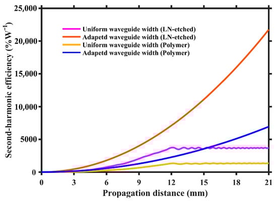 Through above simulated results, the adapted waveguide width design in etched and loaded waveguides based on PPTFLN has been shown to effectively overcome the phase errors arising from inherent nanoscale inhomogeneity, thereby enhancing the power conversion efficiency of SHG. However, despite the utilization of adapted waveguide width design in different types of waveguide, there are distinct advantages and disadvantages for etched and loaded waveguides. As illustrated in Figure 7, the power conversion efficiency of the etched waveguide based on adapted waveguide width design significantly surpasses that of the polymer-loaded waveguide by several magnitudes. Yet the etched waveguide necessitates the direct etching of LN, which not only requires expensive equipment but also intricate processes; thus, obtaining a high-quality etched structure is not an easy task. In contrast, a polymer-loaded waveguide does not require the etching of LN, which only needs spin coating, exposure, and development to complete the fabrication of waveguide structure; thereby, the process is straightforward and amenable to mass production.