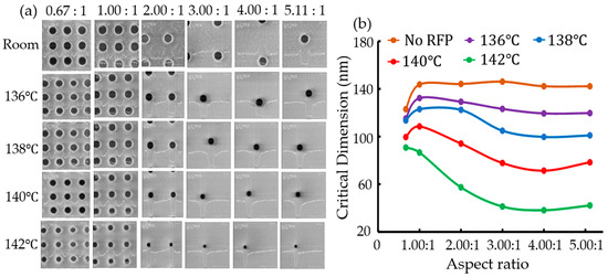 (a) Scanning electron microscope (SEM) images of contact holes (C/Hs) and (b) a graph of critical dimension (CD) with a function of temperature and duty ratio after the thermal resist process. The upper labels of the images in Figure 2a represent the aspect ratio, which is the ratio between the contact hole size and the pitch size.