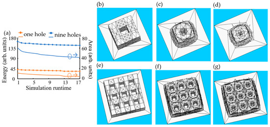 Figure 3 shows the simulation outcomes generated using Surface Evolver (SE), a computer program by Kenneth Brake, using Equations (1) and (2). Surface Evolver (SE) treats three-dimensional (3D) structures as surfaces governed purely by energy optimization criteria. After the resist flow process (RFP), the surface energy and surface area of one contact hole and nine contact holes were reduced due to simulation runtimes, as shown in Figure 3a. Figure 3c,d display the reflowed images of one contact hole versus the simulation runtimes for the surface areas of 38.3685 and 32.9430, respectively. Figure 3f,g illustrate the reflowed images of nine contact holes for the surface areas of 155.0468 and 144.5697, respectively. However, the Surface Evolver (SE)-based model did not require explicit knowledge of material-specific parameters and predicted the dependence of shape evolution on the simulation runtime.