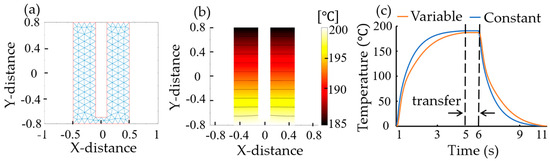 Figure 4 shows the simulation results generated through MATLAB to analyze the resist reflow through thermal cycling at hardbake. A mesh with elements no larger than 0.1 was generated, as illustrated in Figure 4a. The temperature distribution in Figure 4b was calculated from the steady-state solution of Equation (4). For both constant thermal conductivity and temperature-dependent thermal conductivity, Figure 4c illustrates the temperature–time relationship in typical three-stage wafer proximity contact processing, including heating by the preheated hotplate, transfer by the wafer carrier from the hotplate to the chillplate, and cooling by the chillplate. The simulation conditions were mass density = 1, specific heat of the material = 1, constant thermal conductivity of the material = 1, and temperature-dependent thermal conductivity = 0.003 temperature. Compared with the constant-conductivity case, the temperature on the right-hand edge is lower, as shown in Figure 4c. This is due to the lower conductivity in regions with lower temperatures.