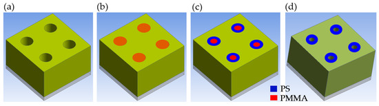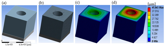 Static structural deformation of one contact hole (C/H) due to heat transfer, generated through ANSYS: (a) the structure of a , a upper plate, and an emptied cylinder with a height of and a radius of , and plots of (b) mashing and deformation at (c) 0.5 s and (d) 1 s simulation times.