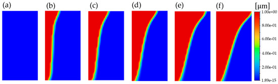 Phase change of a contact hole (C/H) sidewall due to gravity from solid to liquid during thermal reflow, generated using the ANSYS Fluent (Student Edition 2024): melting boundaries at (a) 0 steps, (b) 1 step, (c) 30 steps, (d) 50 steps, (e) 100 steps, and (f) 150 steps.