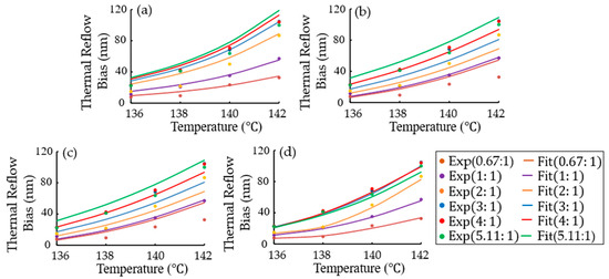 Figure 7 shows the comparison between the experiment results and the simulation results of thermal reflow biases dependent on temperature and pitch sizes in a 193-nm chemically amplified resist (CAR). Depending on the aspect ratio, which is the ratio between the contact hole size and the pitch size, the simulated results from an orthogonal fitting function, linear regressions using a Python program (version 3.12.2) and Scikit-Learn, and a convolutional neural network (CNN) exhibited mismatches with the experimental results within different error ranges. Although the simulation parameters do not account for the chemical phenomenon of thermal reflow, the critical dimension bias after resist reflow can be predicted in a linear system using the fitting function of the experimental data. From Equation (7), the simulated function of thermal bias for a 193-nm chemically amplified resist (CAR), using an orthogonal fitting functional method, was