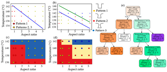 Classifications from a logistic regression in deep learning and a decision tree in machine learning: (a,b) are binary and multiple classifications from TensorFlow, respectively, (c,d) are the decision surfaces of a decision tree for the binary class with the max depth of two and the multiple class with a max depth of three, respectively, and (e) a decision tree for multiple classes with a max depth of four.