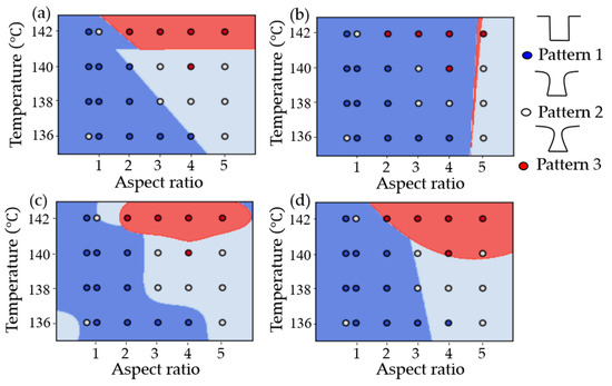 Figure 10 shows a comparison between the predicted pattern types from a convolutional neural network (CNN) and the experimental pattern types based on the side images of reflow resist. The network architecture comprised a dense layer with 25 units and a ReLU activation function, a second dense layer with 15 units and a ReLU activation function, and a third dense layer with 10 units and a linear activation function, totaling 1,638,975 parameters. A softmax function was used to calculate the probabilities. After 100 epochs, the loss value was , as shown in Figure 10. The simulated results agree well with the experimental results [48].